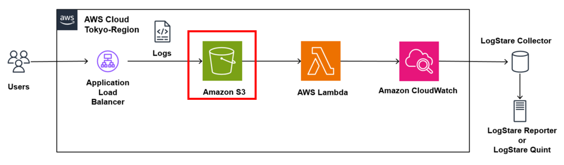 ALBはCloudWatch Logsに直接ログを出力することが出来ず、S3にしか出力できません。そのため、S3に出力されたログを、Lambdaを用いてCloudWatch Logsに集約し、LSCで収集します。