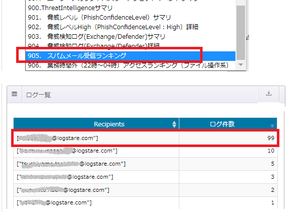 先ほどのMicrosoft Exchange Onlineサマリのログ分析では、メールボックス上の操作を確認しましたが、今度は視点を変えてログ分析レポートテンプレートから「905.スパムメール受信ランキング」テンプレートのサマリレポートを見てみます。これは前の章でご案内した、脅威と判断されたログ(ThreadIntelligenceログ)に関連するUserIdのランキングです。数が多いということはそれだけ脅威となるメールを多く受け取っている可能性があり、このユーザーには届いたメールで怪しいリンクやメールなど開かないよう指導していく必要があることが分かります。