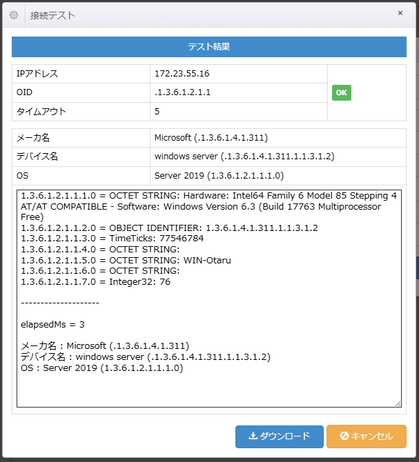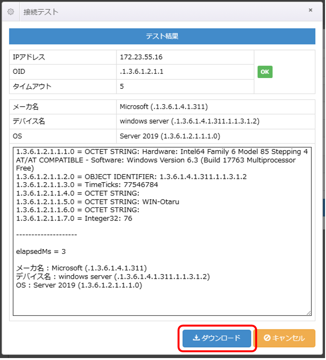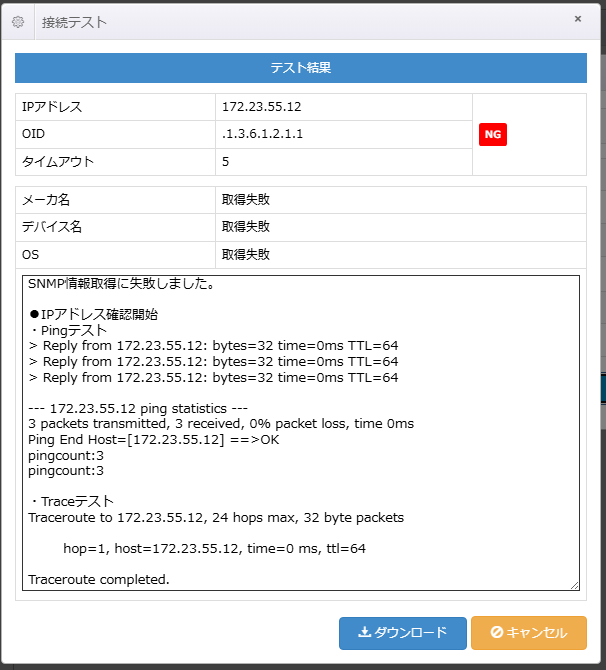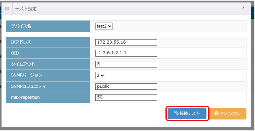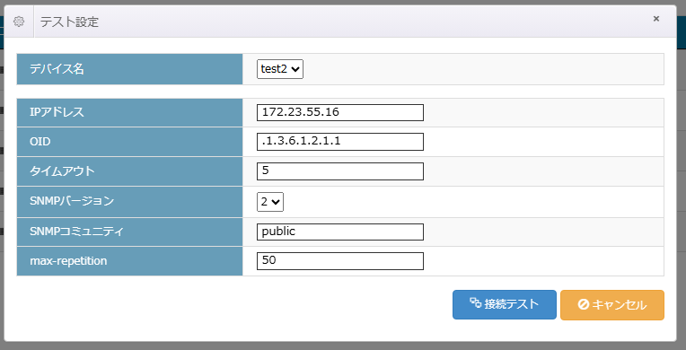 特定の監視対象デバイスにおいてSNMP通信が上手くいかない時などに通信テストを行うことが出来ます。