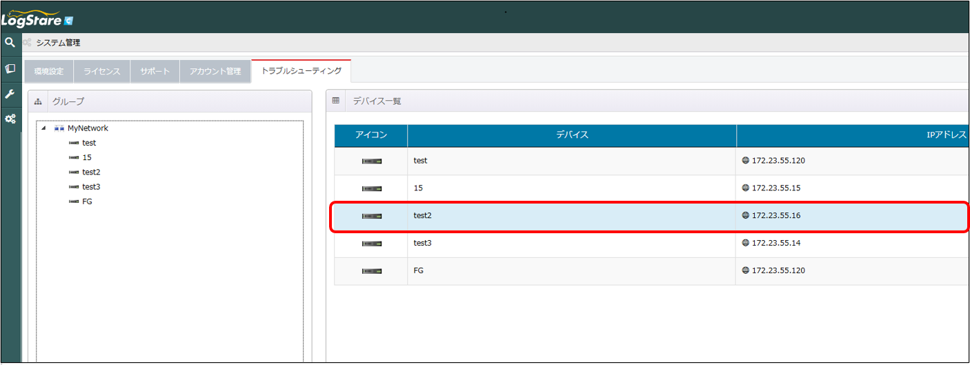 テストしたい監視端末を選択します。(ここではtest2を選択)