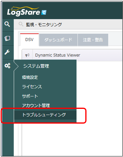 LSC管理画面の左上から「システム管理」>「トラブルシューティング」を選択します。