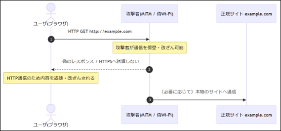 悪意ある人間が公衆Wi-Fiを持ち込んで、DNSやARPをいじられても、HTTP通信にフォールバックさせられないようにして、被害を防ぎます。