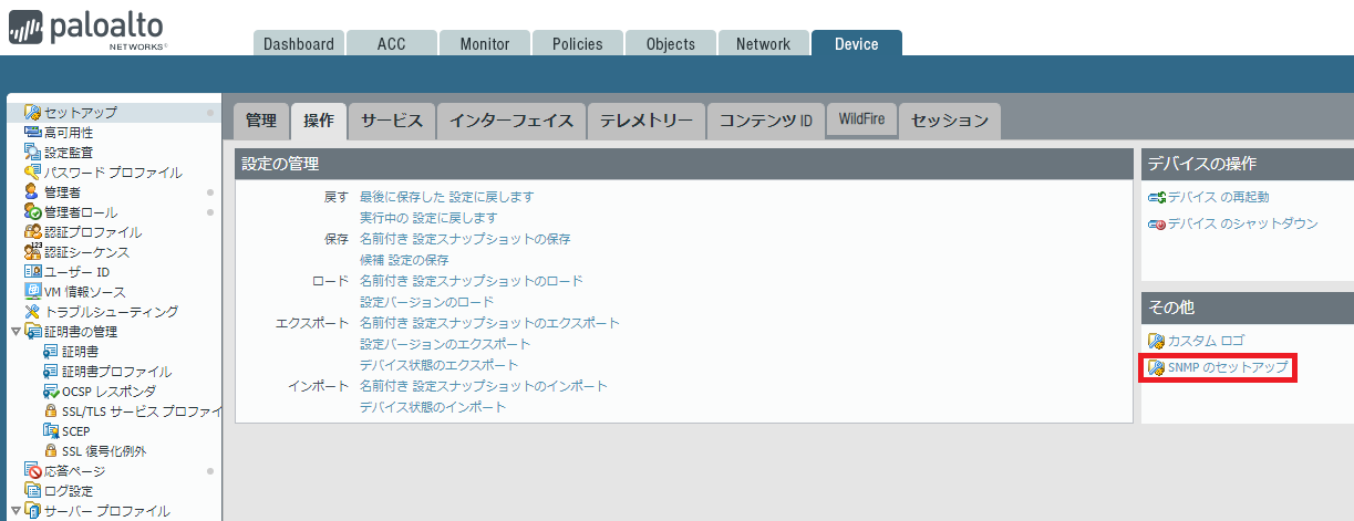- Palo Alto のWeb UI 内上部タグ[Device] → [セットアップ] → [操作] と移動します。