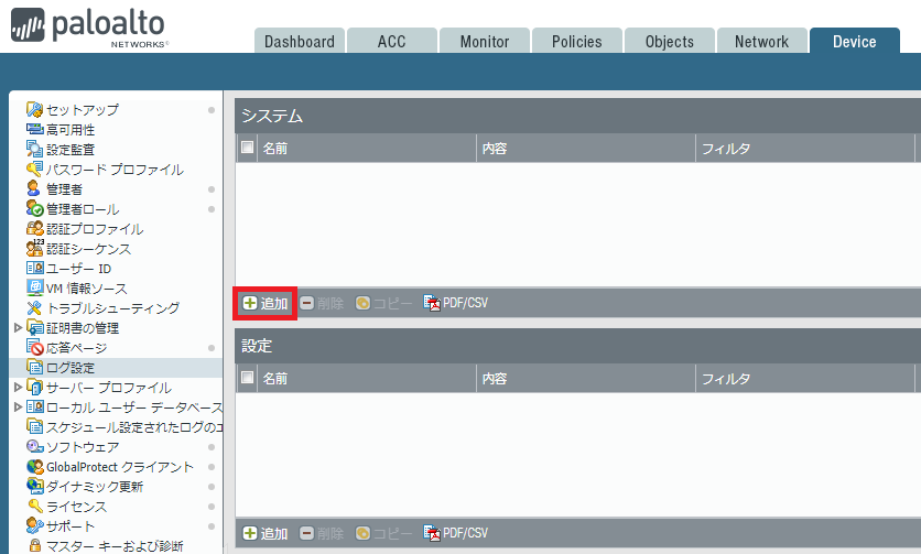 - Palo Alto のWeb UI 内上部タグ[Device] → [ログ設定] と移動します。