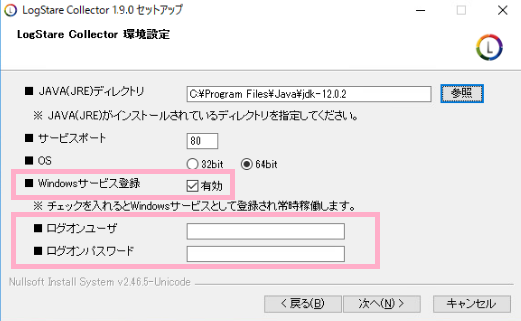 Windowsサービス登録のチェックを外してから、ログオンユーザとログオンパスワードを空欄にして「次へ」をクリックしてください。