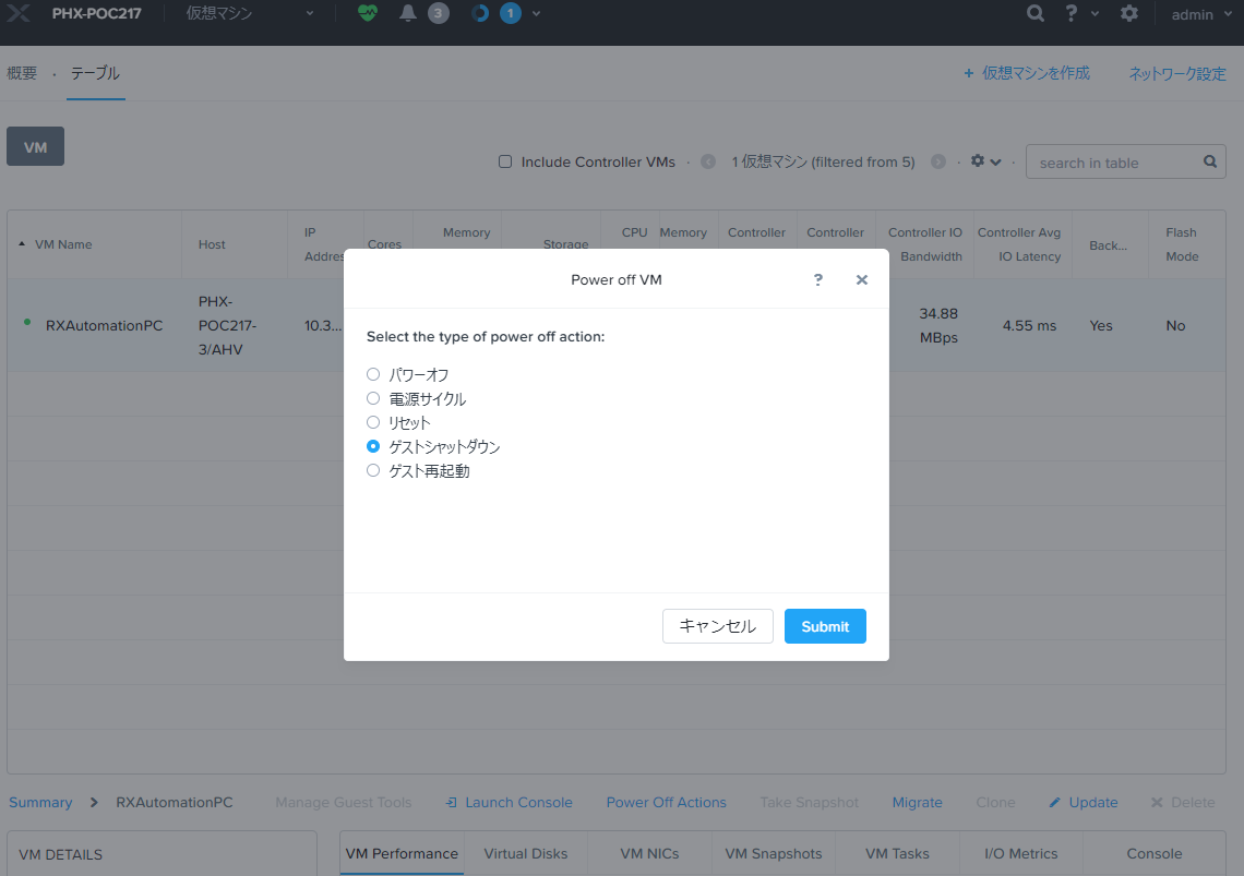 仮想マシン名やリソース情報(CPU/メモリ)や電源状態が確認できました。