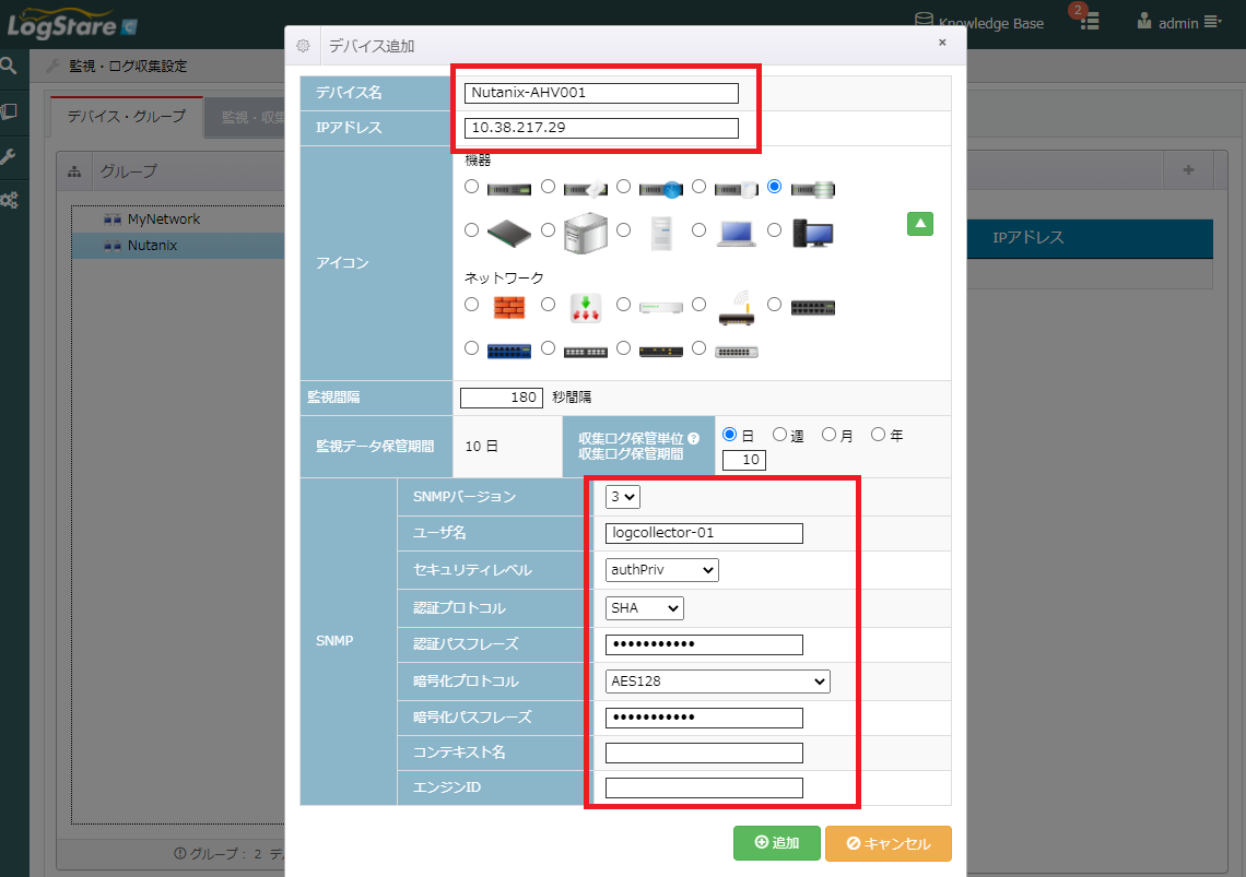 デバイス名:任意の監視対象名(ここではNutanix-AHV001)